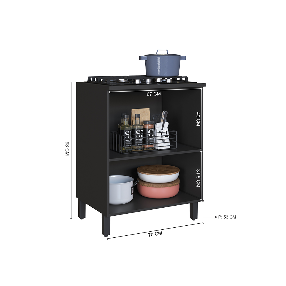 Balcão de 70 cm 2 Portas Dimensões: – Largura: 70 cm – Altura: 93 cm – Profundidade: 53 cm