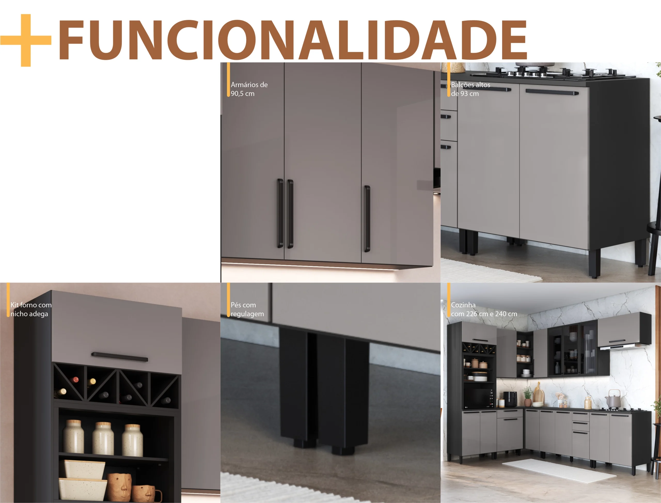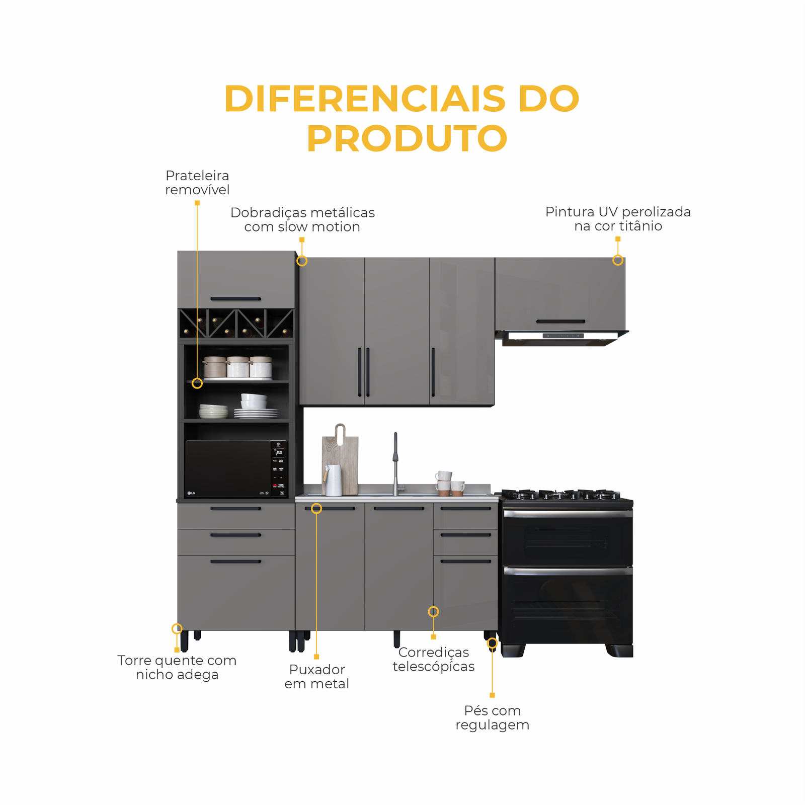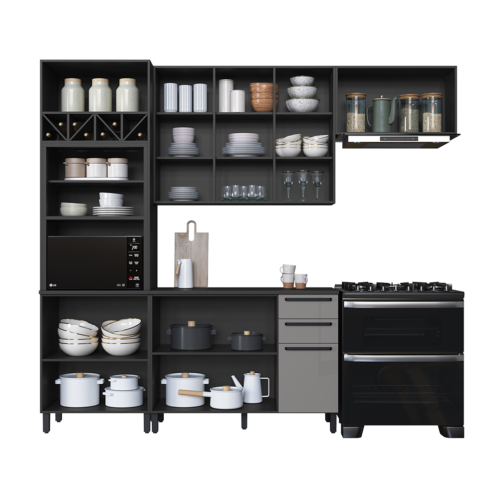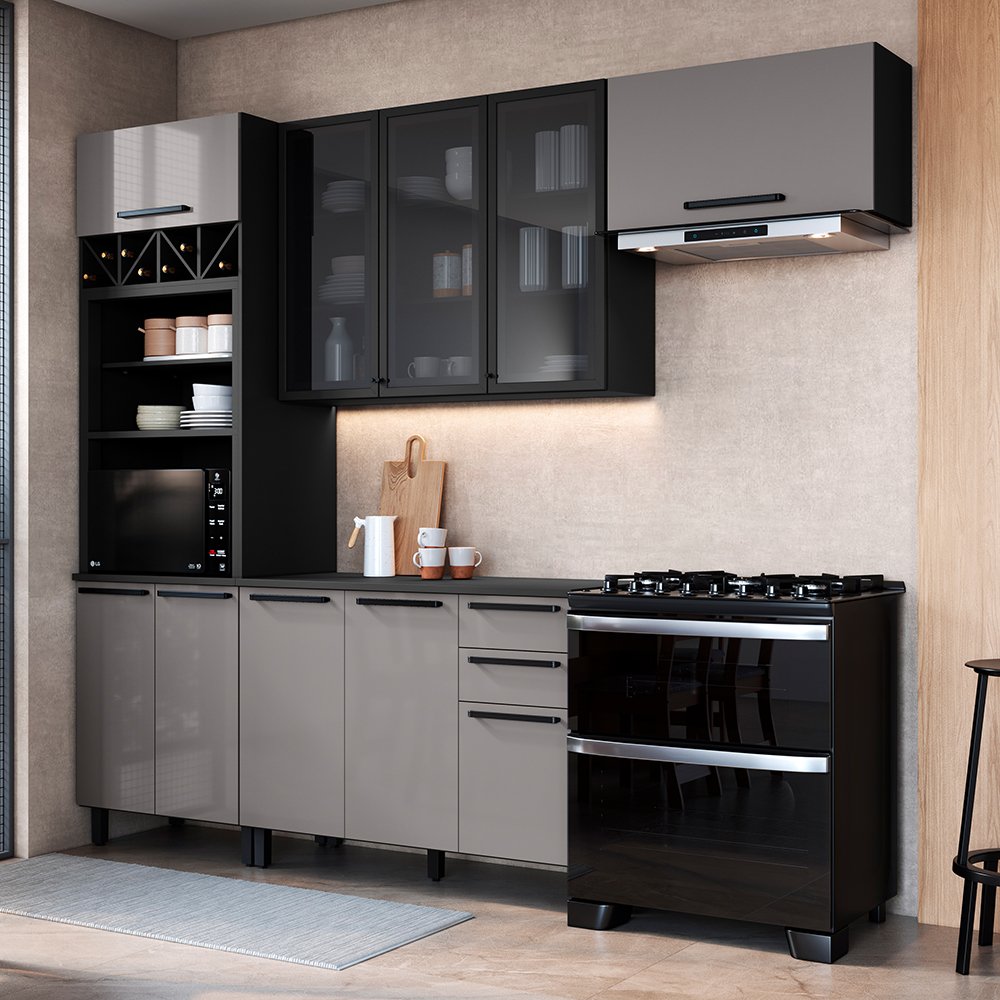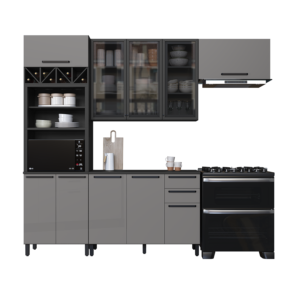 Cozinha completa 100% em MDF, com portas em vidro refletivo que valorizam o ambiente. Conta com armários superiores e inferiores espaçosos, cristaleira com prateleiras em vidro, adega para vinhos e nichos organizadores. Os puxadores metálicos e as ferragens de alta qualidade garantem abertura suave e resistência no uso diário. Design moderno, funcional e elegante para deixar sua casa ainda mais bonita.