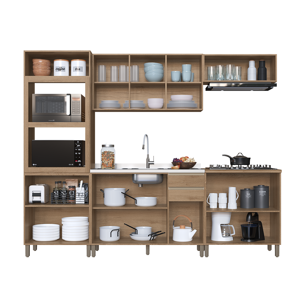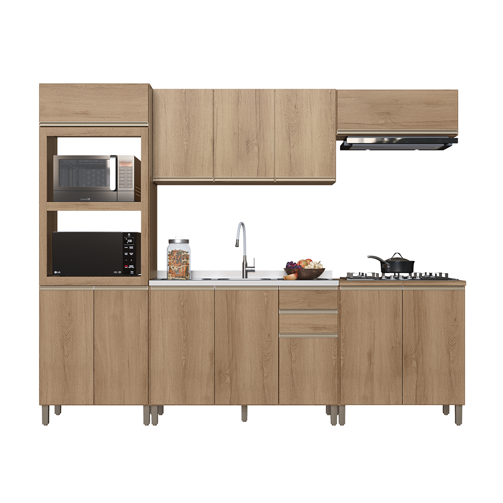 Cozinha completa 100% em MDF. Conta com armários superiores e inferiores espaçosos, adega para vinhos e nichos organizadores. Os puxadores metálicos e as ferragens de alta qualidade garantem abertura suave e resistência no uso diário. Design moderno, funcional e elegante para deixar sua casa ainda mais bonita.